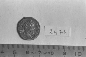 Recto: Testa laureata di Settimio Severo, a destra . Contorno di perline.\nVerso: Roma, elmata, drappeggiata sino ai piedi, seduta, a sinistra, su scudo rotondo, con palladium nella destra protesa e scettro nella sinistra, appoggia il piede su uno sbabello. Contorno di perline.