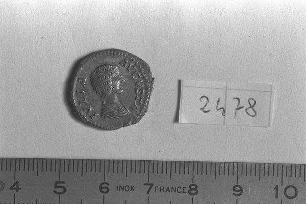 Recto: Busto drappeggiato di Julia Domna, a destra , con capelli disposti in quattro linee di ondulazione e raccolti a chignon. Contorno di perline.\nVerso: Giunone, con stephane e velo, drappeggiata, stante, di fronte, rivolta a sinistra, con patera nella destra protesa e scettro verticale nella sinistra; a sinistra, davanti a lei, pavone, stante, a sinistra, retrospiciente. Contorno di perline.