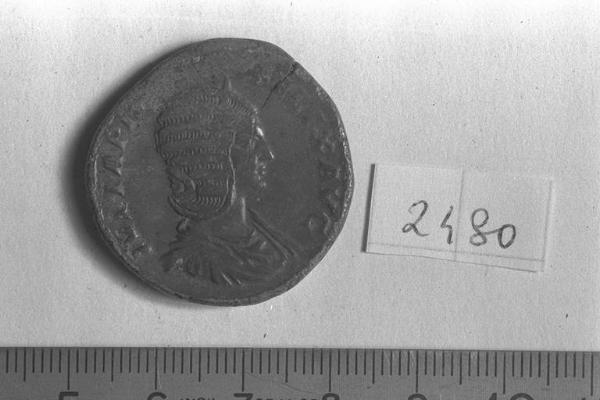 Recto: Busto drappeggiato di Julia Domna, a destra con capelli raccolti a chignon e coda sulla nuca, disposti in sette pieghe ondulate. Contorno di perline.\nVerso: Felicitas, drappeggiata, stante, di fronte, rivolta a sinistra, in atto di sacrificare sopra un altare acceso e ornato di ghirlande, a sinistra, tenendo la patera nella destra e un lungo caduceo nella sinistra. Contorno di perline.