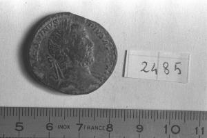 Recto: Testa laureata di Caracalla, a destra , con lembo di drappeggio sulla spalla sinistra. Contorno di perline.\nVerso: Caracalla, velato, togato, stante, di fronte, rivolto a sinistra, in atto di sacrificare davanti a tripode acceso, a sinistra, con patera nella destra e rotolo nella sinistra lungo il fianco; dietro il tripode, toro prostrato, a sinistra. Contorno di perline.