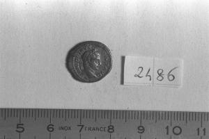 Recto: Testa laureata di Caracalla, a destra . Contorno di perline.\nVerso: Victoria, alata, drappeggiata, gradiente, a sinistra, con corona nella destra protesa e palma, appoggiata alla spalla, nella sinistra. Contorno di perline.