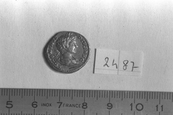 Recto: Busto laureato e drappeggiato di Caracalla, a destra . Contorno di perline.\nVerso:Trofeo, formato da elmetto, corazza, lance, scudi e schinieri, ai piedi del quale si vedono due prigionieri, seduti, a sinistra e a destra , con copricapi a punta e lunghe vesti, che si sorreggono la testa con la destra appoggiata al ginocchio. Contorno di perline.