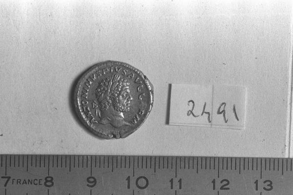Recto: Testa laureata di Caracalla, a destra . Contorno di perline.\nVerso: Apollo, laureato, a torso nudo, seduto, a sinistra, su sedile basso, con ramo nella destra. appoggia il gomito sinistro alla lyra, collocata su tripode, a destra . Contorno di perline.
