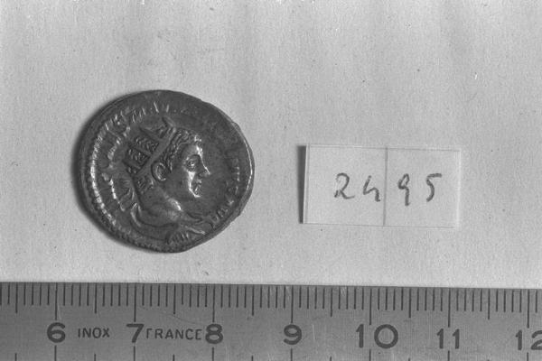 Recto: Busto radiato, drappeggiato e corazzato di Elagabalo, a destra , visto di spalle. Contorno di perline.\nVerso: Marte, con elmo e mantello fluttuante dietro il corpo nudo, gradiente a destra , con lancia trasversale puntata in alto nella destra e trofeo nella sinistra appoggiato alla spalla. Contorno di perline.