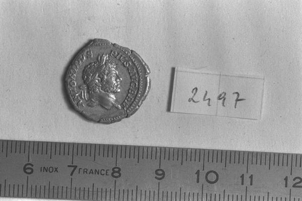 Recto: Testa laureata di Caracalla, a destra . Contorno di perline.\nVerso: Libertas, drappeggiata, stante, di fronte, rivolta a sinistra, con pileus nella destra e vindicta nella sinistra. Contorno di perline.