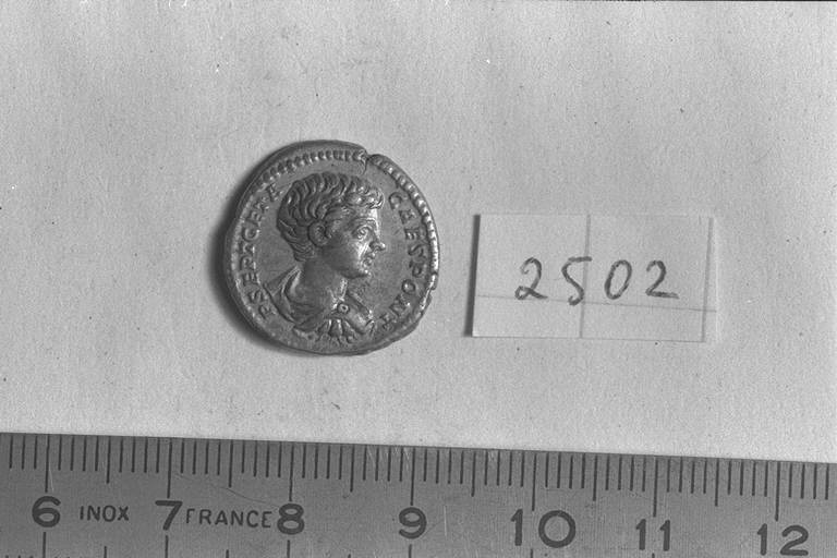 Recto: Busto drappeggiato e corazzato di Geta, a destra , a testa nuda. Contorno di perline.\nVerso: Geta, in vesti militari, con mantello che gli pende alle spalle, stante, di fronte, rivolto a sinistra, con ramo nella destra e lancia verticale, riversa, nella sinistra. Contorno di perline.