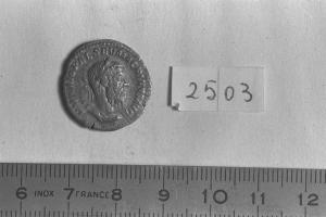 Recto: Busto laureato e corazzato di Macrino, a destra . Contorno di perline.\nVerso: Giove, nudo, stante, di fronte, rivolto a sinistra, con fulmine nella destra e scettro verticale nella sinistra. Contorno di perline.