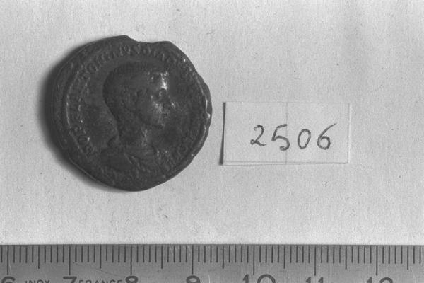 Recto: Busto drappeggiato e corazzato di Diadumeniano, a destra , a testa nuda., visto dalla fronte. Contorno di perline.\nVerso: Diadumeniano, in vesti militari, stante, di fronte, rivolto a sinistra, con stendardo verticale nella destra e lancia nella sinistra; a destra , due stendardi piantati a terra. Contorno di perline.