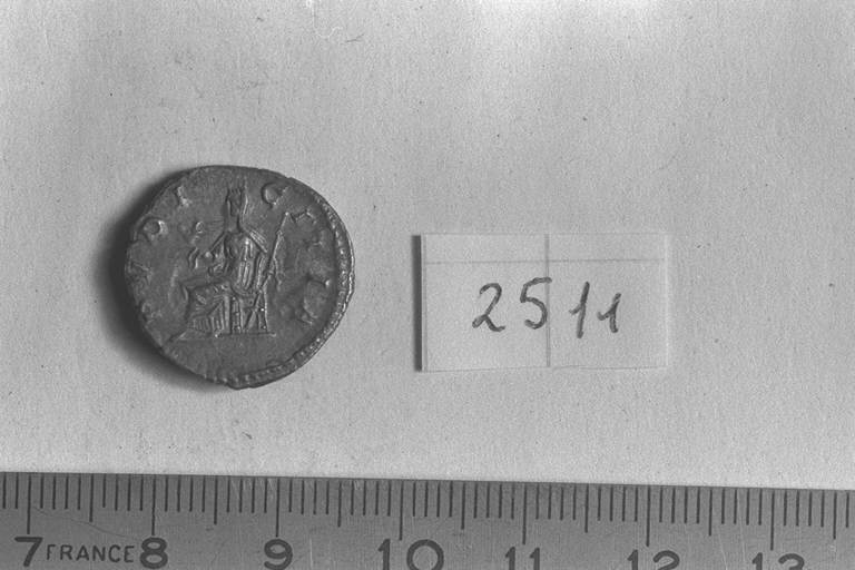 Recto: Busto drappeggiato a testa nuda di Julia Maesa, a destra , con capelli ondulati disposti a onde verticali e raccolti a chignon. Contorno di perline.\nVerso: Pudicitia, velata e drappeggiata, seduta, a sinistra, su seggio, scosta il velo con la destra, tenendo, con la sinistra, lo scettro. Contorno di perline.