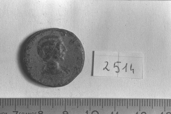 Recto: Busto drappeggiato a testa nuda di Julia Maesa, a destra , con capelli ondulati disposti a onde verticali e raccolti a chignon. Contorno di perline.\nVerso: Pudicitia, velata e drappeggiata, seduta, a sinistra, su seggio, scosta il velo con la destra, tenendo, con la sinistra, lo scettro. Contorno di perline.