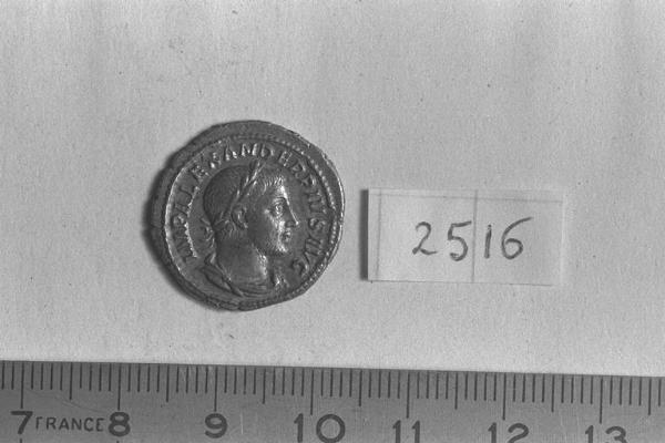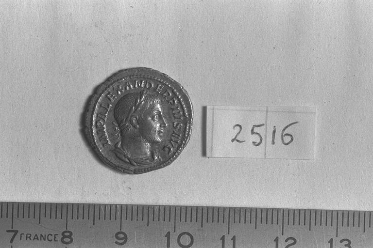 Recto: Busto laureato, drappeggiato e corazzato di Severo Alessandro, a destra , visto dalla fronte. Contorno di perline.\nVerso: Giove, con mantello fluttuante dalla spalla dietro il corpo nudo, stante, di fronte, retrospiciente a destra , con il corpo spostato a sinistra, leva il fulmine con la destra e tiene l'aquila nella sinistra. Contorno di perline.