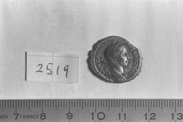 Recto: Busto laureato e drappeggiato di Severo Alessandro, a destra . Contorno di perline.\nVerso: Annona, drappeggiata, stante, di fronte, rivolta a sinistra, con spighe di grano nella destra e cornucopia nella sinistra; a sinistra, ai suoi piedi, modius con due spighe. Contorno di perline.