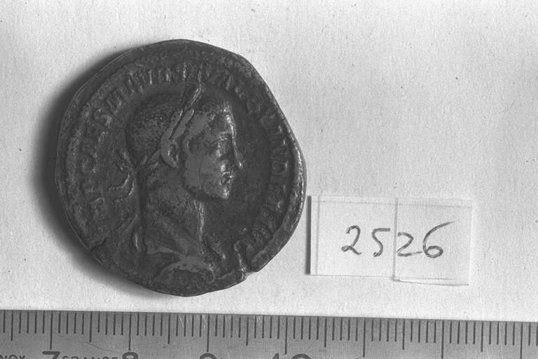 Recto: Busto laureato e drappeggiato di Severo Alessandro, a destra . Contorno di perline.\nVerso: Marte, con elmo e mantello fluttuante dietro le spalle sul corpo nudo, gradiente, a destra , con lancia puntata in alto nella destra e trofeo nella sinistra appoggiato alla spalla. Contorno di perline.