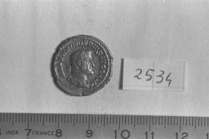 Recto: Busto laureato, barbato, drappeggiato e corazzato di Massimino il Trace, a destra . Contorno di perline.\nVerso: Massimino il Trace, in vesti militari, stante, di fronte, rivolto a sinistra, tra due stendardi, leva la destra e impugna la lancia verticale con la sinistra. Contorno di perline.