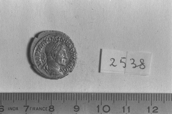 Recto: Busto laureato, barbato, drappeggiato e corazzato di Massimino il Trace, a destra . Contorno di perline.\nVerso: Pax, diademata, drappeggiata, stante, di fronte, rivolta a sinistra, con ramo nella destra e lancia trasversale nella sinistra. Contorno di perline.