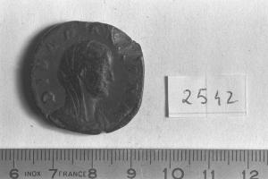 Recto: Busto velato e drappeggiato di Diva Paulina, a destra . Contorno di perline.\nVerso: Paulina, seduta, a sinistra, su un pavone in volo a destra , leva la destra, tenendo lo scettro nella sinistra. Contorno di perline.