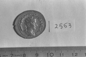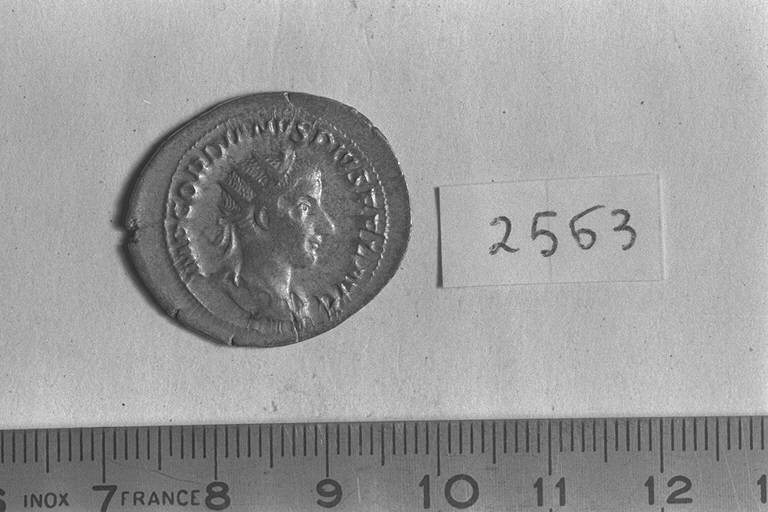 Recto: Busto radiato, drappeggiato e corazzato di Gordiano III, a destra . Contorno di perline.\nVerso: Virtus, con elmo crestato e vesti militari, stante, di fronte, rivolta a sinistra, leva la destra con ramo e impugna la lancia con la sinistra; a terra, accanto al piede destro, scudo ovale.Contorno di perline.