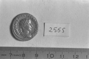 Recto: Busto radiato, drappeggiato e corazzato di Gordiano III, a destra . Contorno di perline.\nVerso: Roma, elmata, drappeggiata, seduta su scudo ovale, a sinistra, con Victoria nella destra protesa e lancia nella sinistra. Contorno di perline.