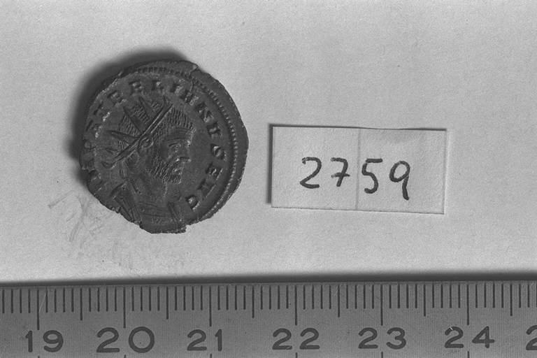 Recto: Busto radiato e corazzato di Aureliano, a destra , visto dalla fronte. Contorno di perline.\nVerso: Pannonia, velata e drappeggiata, stante, di fronte, rivolta a destra , con la destra levata e insegna trasversale nella sinistra. Contorno di perline.