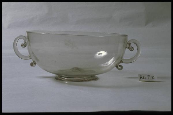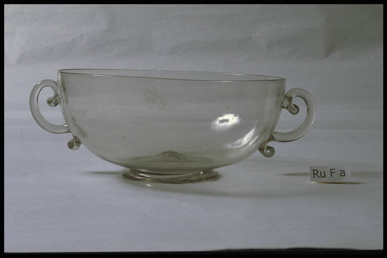 Orlo arrotondato; coppa emisferica; piede ad anello applicato a caldo; fondo con accenno di rientro a cono. Due anse laterali a riccio applicate superiormente poco sotto l'orlo, inferiormente a circa metà della coppa. Vetro incolore.