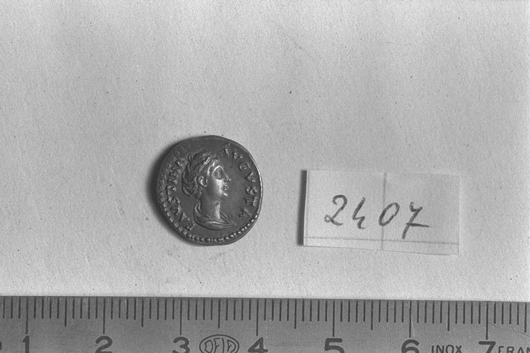 Recto: Busto drappeggiato di Faustina I, a destra , con diadema di perle. Contorno di perline.\nVerso: Giunone (?), drappegiata, con patera nella destra protesa e scettro verticale nella sinitra. Contorno di perline.