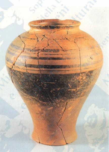 Olla con fondo piatto, profilo piriforme, breve collo con labbro estroflesso, utilizzato come vaso cinerario, in argilla rossastra, fine, modellato al tornio, con decorazione dipinta a fasce e ondine nere.