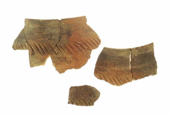 Orlo superiormente appiattito e assottigliato, leggermente inclinato verso l'interno, breve labbro rettilineo quasi verticale, spalla indistinta poco pronunciata, corpo ovoide. La spalla è decorata da incisioni parallele oblique (da alto a sinistra in basso a destra) fitte e profonde, eseguite probabilmente con uno strumento appuntito.