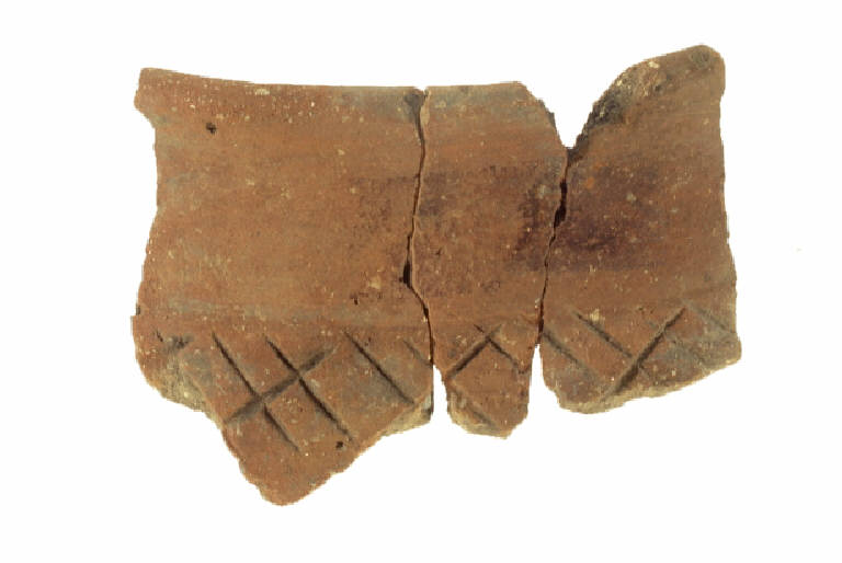 Orlo leggermente appiattito e distinto all'interno, breve labbro rettilineo verticale, spalla indistinta poco pronunciata. Sulla spalla incisioni oblique a reticolo.