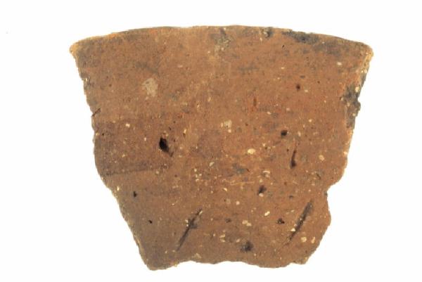 Orlo arrotondato, labbro indistinto, vasca troncoconica poco profonda. Sull'orlo impressioni a tacche di forma allungata o subcircolare.