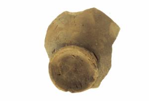 Vasca troncoconica a profilo leggermente arrotondato, basso e massiccio piede ad anello leggermente svasato. \nSul fondo esterno X con ulteriore trattino all'incrocio delle aste.
