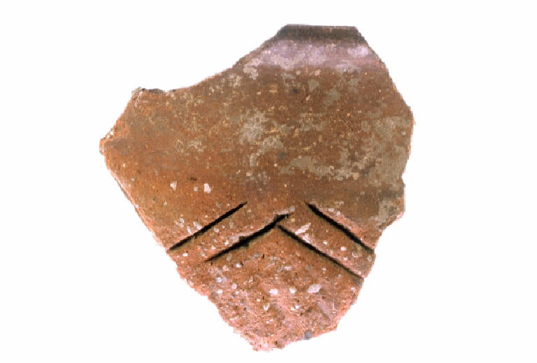 Orlo leggermente assottigliato, labbro rientrante a profilo leggermente curvilineo, spalla distinta mediamente pronunciata, corpo a profilo curvilineo. Incisioni profonda e zig zag doppio alla base della spalla, traccia di scanalature quasi verticali sul corpo.