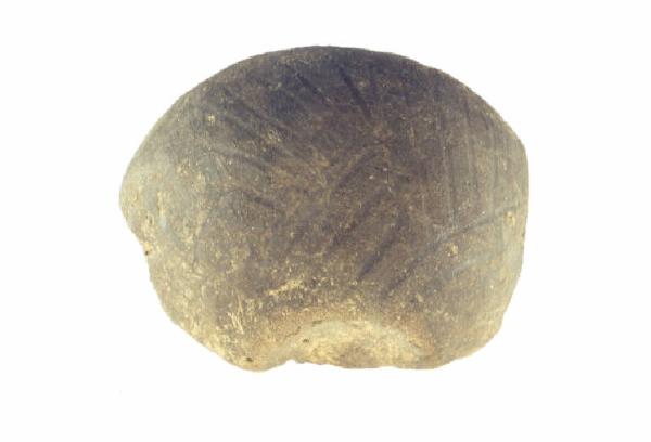 Corpo a profilo curvilineo, leggermente schiacciato in corrispondenza del punto di massima espansione, fondo convesso. Composizione a stralucido, con sovrapposizione di fasci di linee parallele leggermente curvilinee, con diverso orientamento.