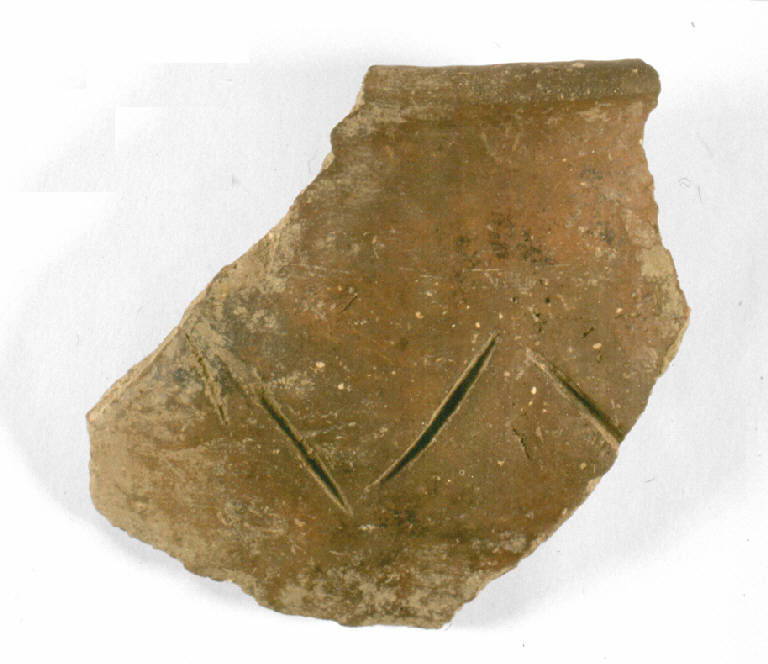 Orlo arrotondato, ingrossato e distinto verso l'esterno, breve labbro verticale a profilo leggermente curvilineo, spalla molto sfuggente, corpo ovoide. Incisioni larghe e profonde a zigzag semplice non continuo sulla spalla.