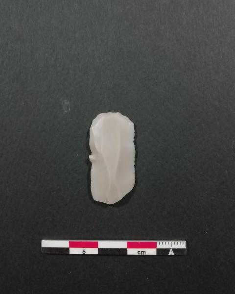 Grattatoio piatto frontale lungo (G1) su lama a sezione trapezoidale in selce di colore bianco trasparente, frammentata nella porzione prossimale. Ritocco semierto nella parte distale a profilo arrotondato.