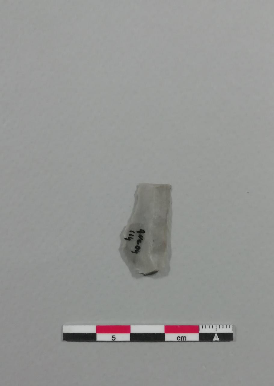 Raschiatoio lungo su lama (L1) a sezione trapezoidale in selce grigia, frammentato nella parte distale. Ritocco semplice marginale alternante sul lato destro.