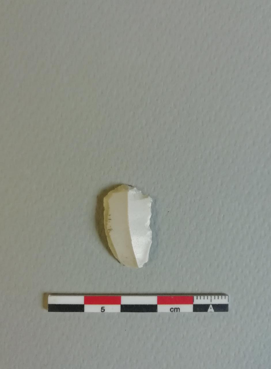 Grattatoio frontale corto (G3) su scheggia in selce bianca. Ritocco sopraelevato diretto nella parte distale a profilo arrotondato.