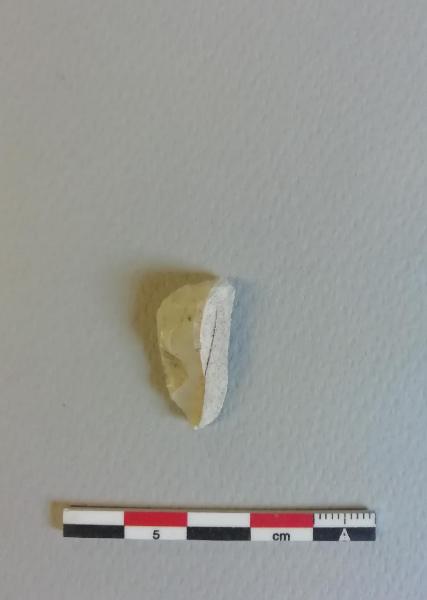 Grattatoio carenato frontale (G9) su scheggia in selce bianca con cortice. Ritocco sopraelevato diretto nella parte distale.