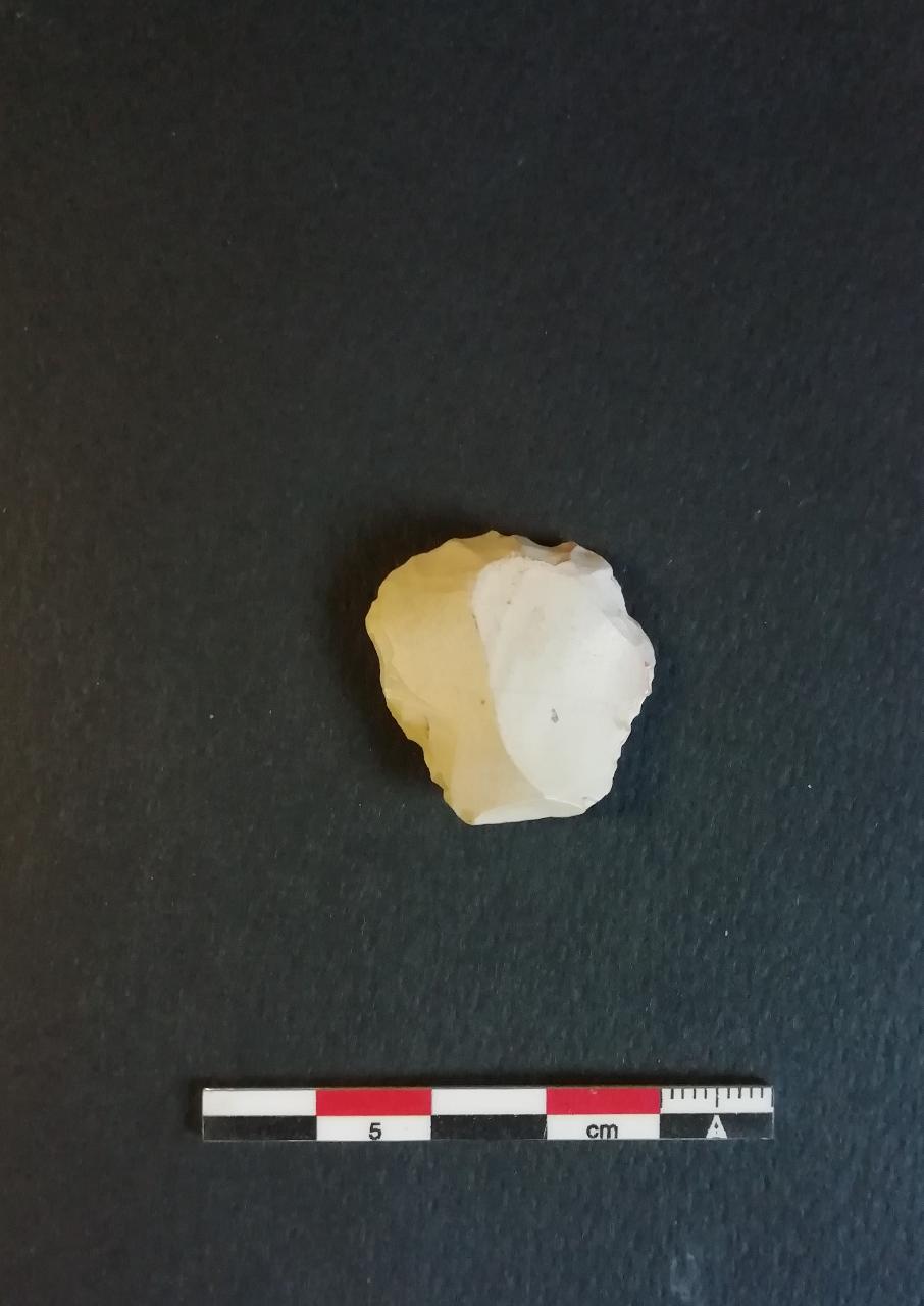 Grattatoio frontale corto a ritocco alterale (G4) su scheggia in selce bianca. Ritocco sopraelevato diretto totale nella parte distale e semierto marginale diretto totale lungo i lati.