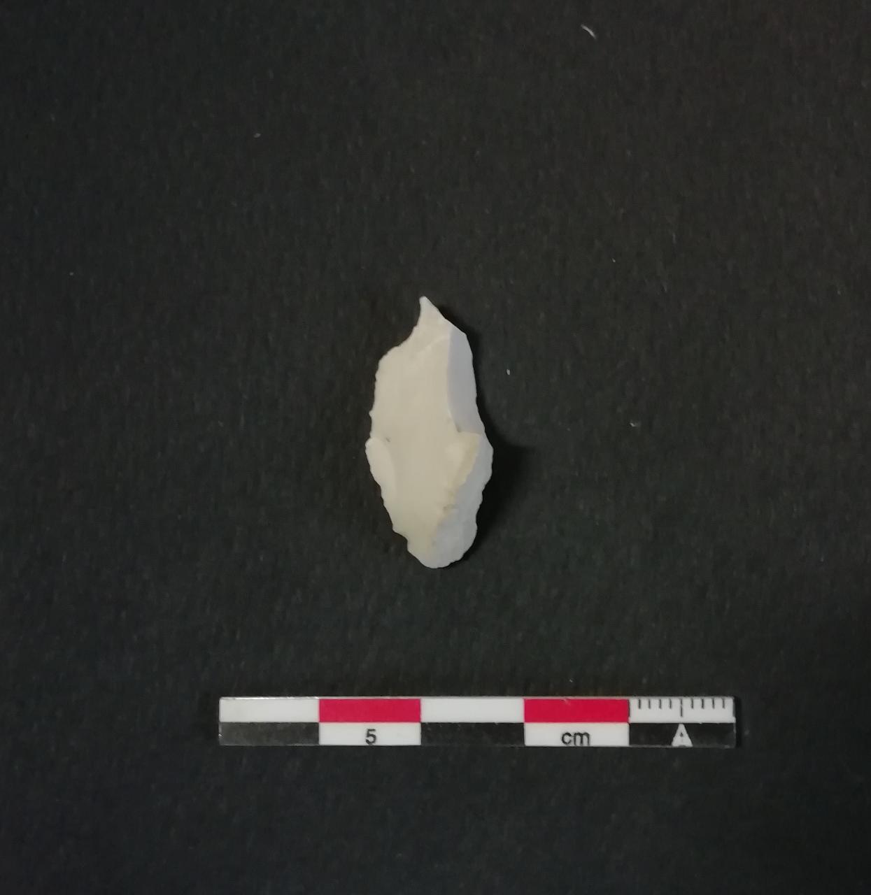 Becco (Bc1) su scheggia in selce bianca con cortice. Ritocco erto nella parte distale e lungo il lato destro, a formare un becco.