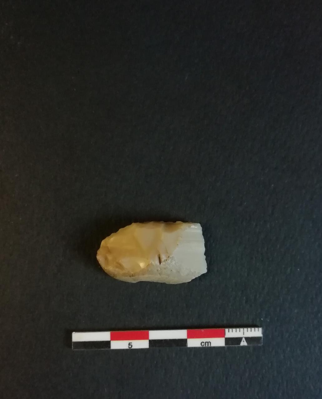 Grattatoio frontale corto a ritocco laterale (G4) su scheggia in selce bianca con cortice. Ritocco sopraelevato, diretto, invadente nella parte prossimale, pseudo-ritocco da utilizzo sulla troncatura normale (T2) lungo il lato sinistro. Asse strumento ruotato di 180° rispetto all'asse della scheggia.