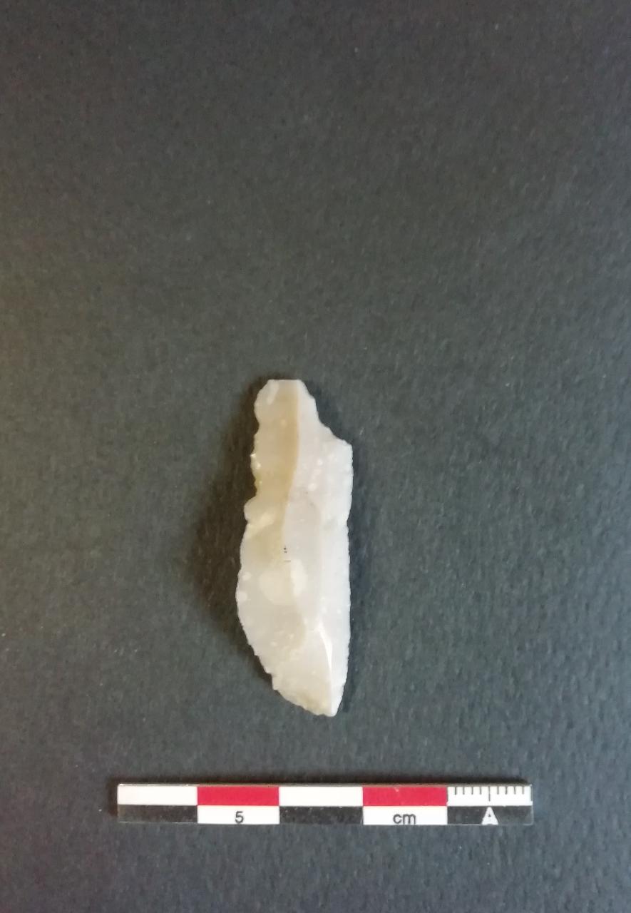 Raschiatoio denticolato (D2) su lama in selce bianca, frammentata all'estremità distale. Ritocco semierto diretto denticolato parziale nella parte superiore del lato sinistro, ritocco erto a formare un incavo nella parte superiore del lato destro.