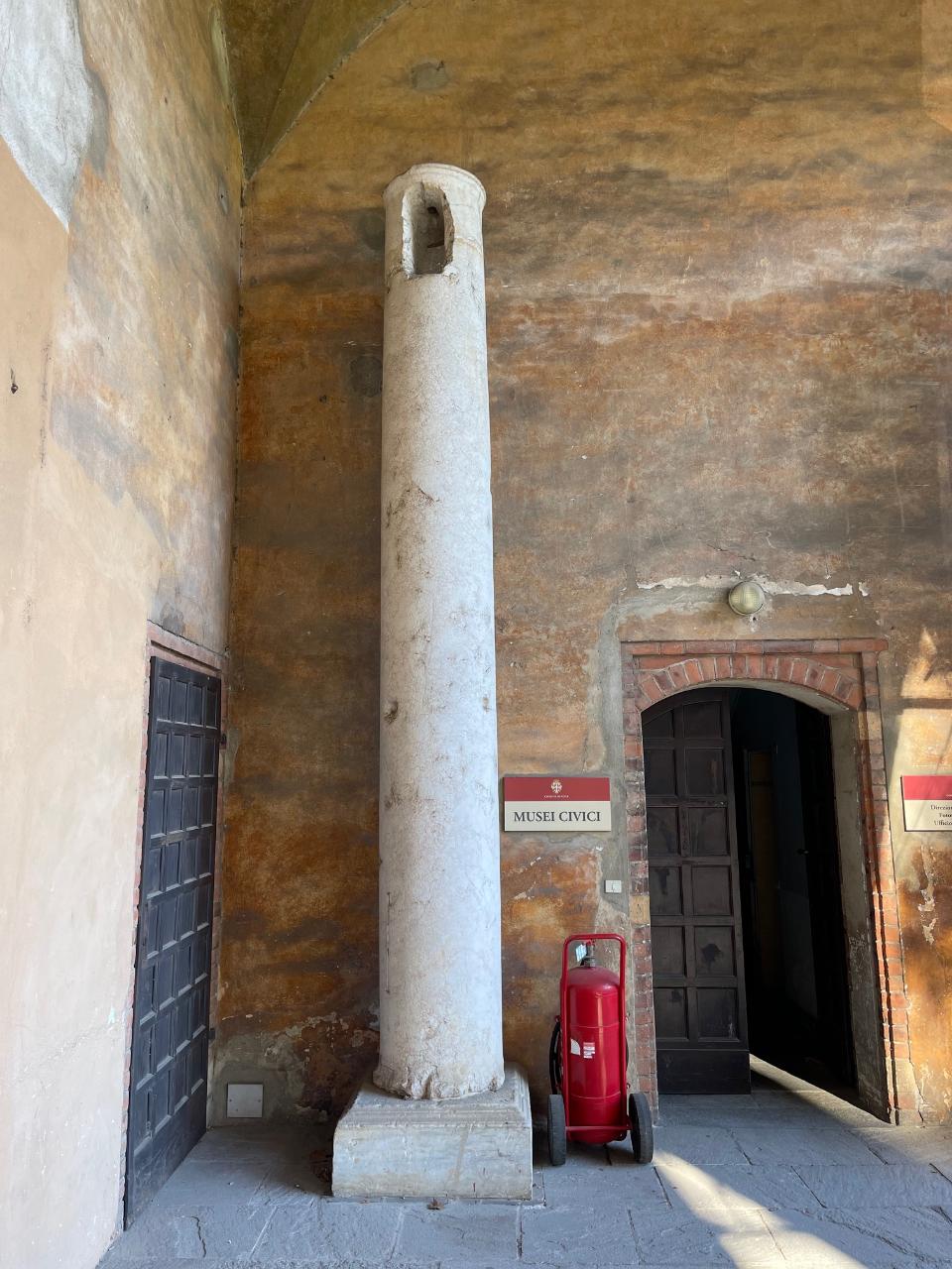 Il fusto di colonna proviene dall'antica cattedrale di Pavia. Il calcare veronese era molto apprezzato in età romana per i colori caldi e i disegni sulla superfice. Il foro sulla sommità fu realizzato in fase di reimpiego.