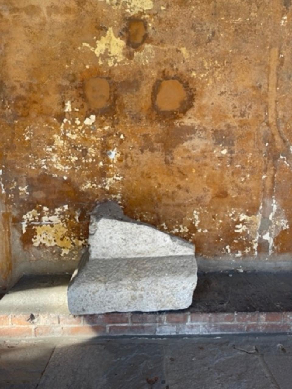 Frammento di un monumento funebre, probabilmente un cippo o un'ara. Sul lato rimangono i piedi di una figura, unico resto della decorazione scultorea. Il reperto proviene da Piazza del Municipio, ritrovato durante gli scavi del palazzo dell'INAIL.