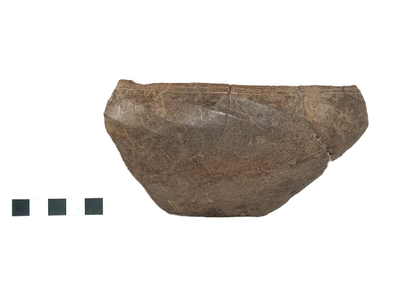 Scodella carenata con orlo estroflesso, parete superiore rettilinea introflessa, carena ingrossata , decorata da tre linee incise orizzontali sotto l'orlo e da costolature oblique lungo il diametro massimo. Impasto medio grigio, superficie lisciata opaca bruno chiaro.