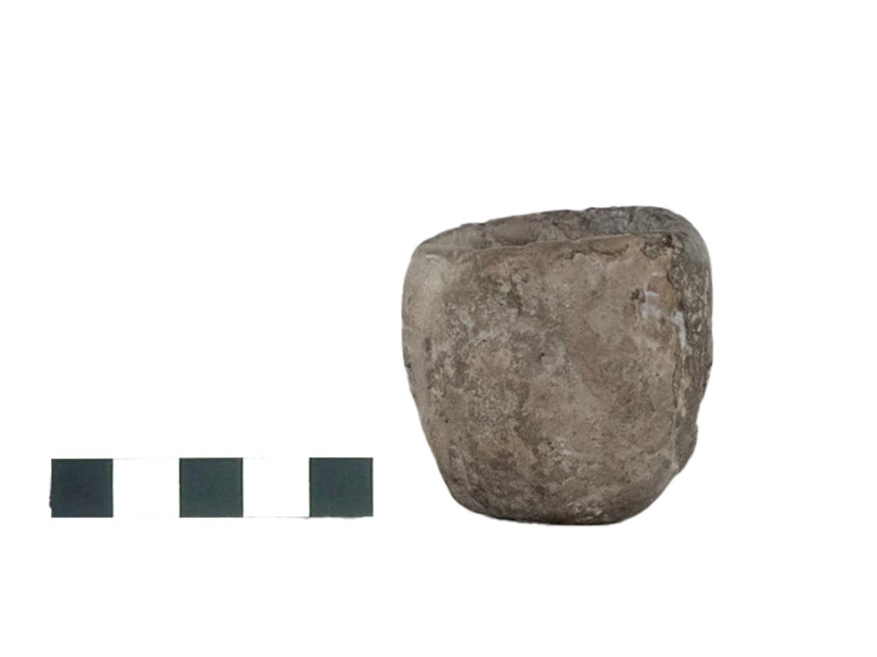 Vasetto a corpo cilindrico con orlo arrotondato, parete e fondo convessi. Impasto medio di colore grigio e superficie irregolare opaca.