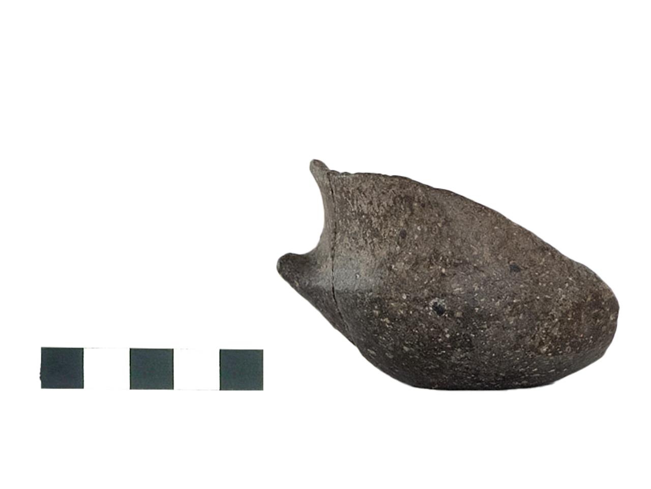 Piccola tazza carenata con orlo arrotondato, parete distinta concava verticale, vasca troncoconica, fondo piatto e presa a linguetta (o resto di un'ansa sopralevata fortemente abraso). Impasto medio di colore grigio e superficie lisciata opaca.