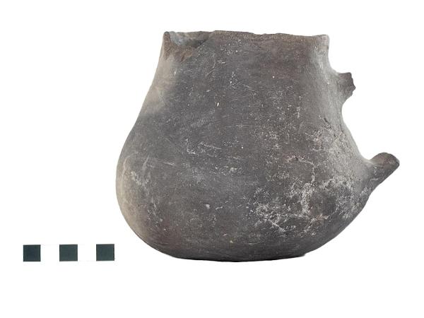 Boccale piriforme con orlo assottigliato e fondo convesso, ansa mancante. Impasto medio di colore grigio scuro e superficie lisciata opaca grigia.