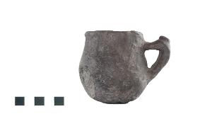 Boccale globoso di piccole dimensioni con orlo arrotondato debolmente estroflesso, corpo globoso, fondo convesso, con ansa a nastro a gomito con tubercolo apicale. Impasto medio grigio scuro, superficie lisciata opaca.
