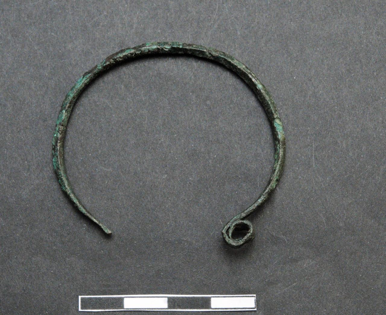 Armilla a capi aperti a sezione lenticolare con estremità appiattita a lamina.\n