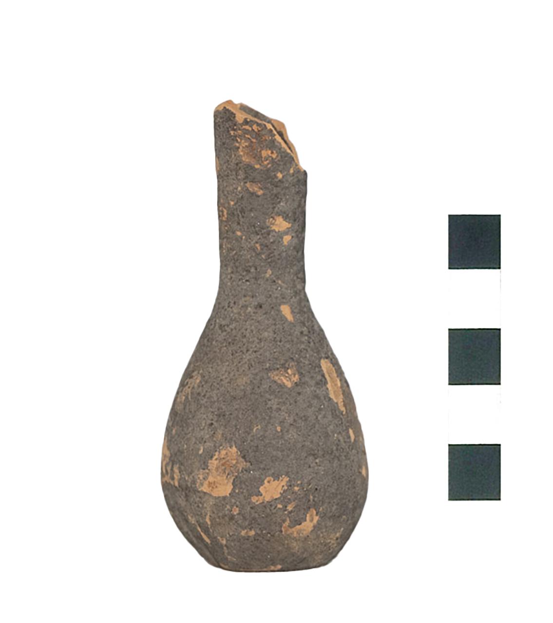Balsamario a corpo piriforme, collo cilindrico svasato verso l'alto e privo di orlo.\n